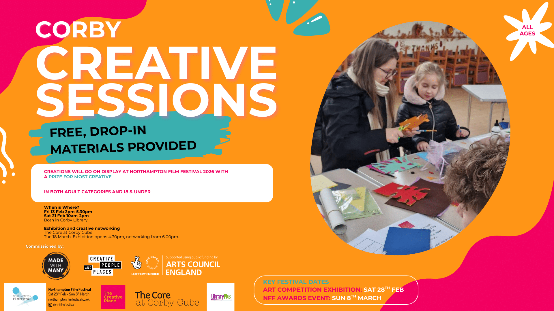 Creatives of Corby…. this one’s for you! We are running a series of sessions + an Exhibition in Corby so you can contribute to Northampton Film Festival 2026! For all ages and abilities, free to come along, have a play, and get creative. (materials provided)